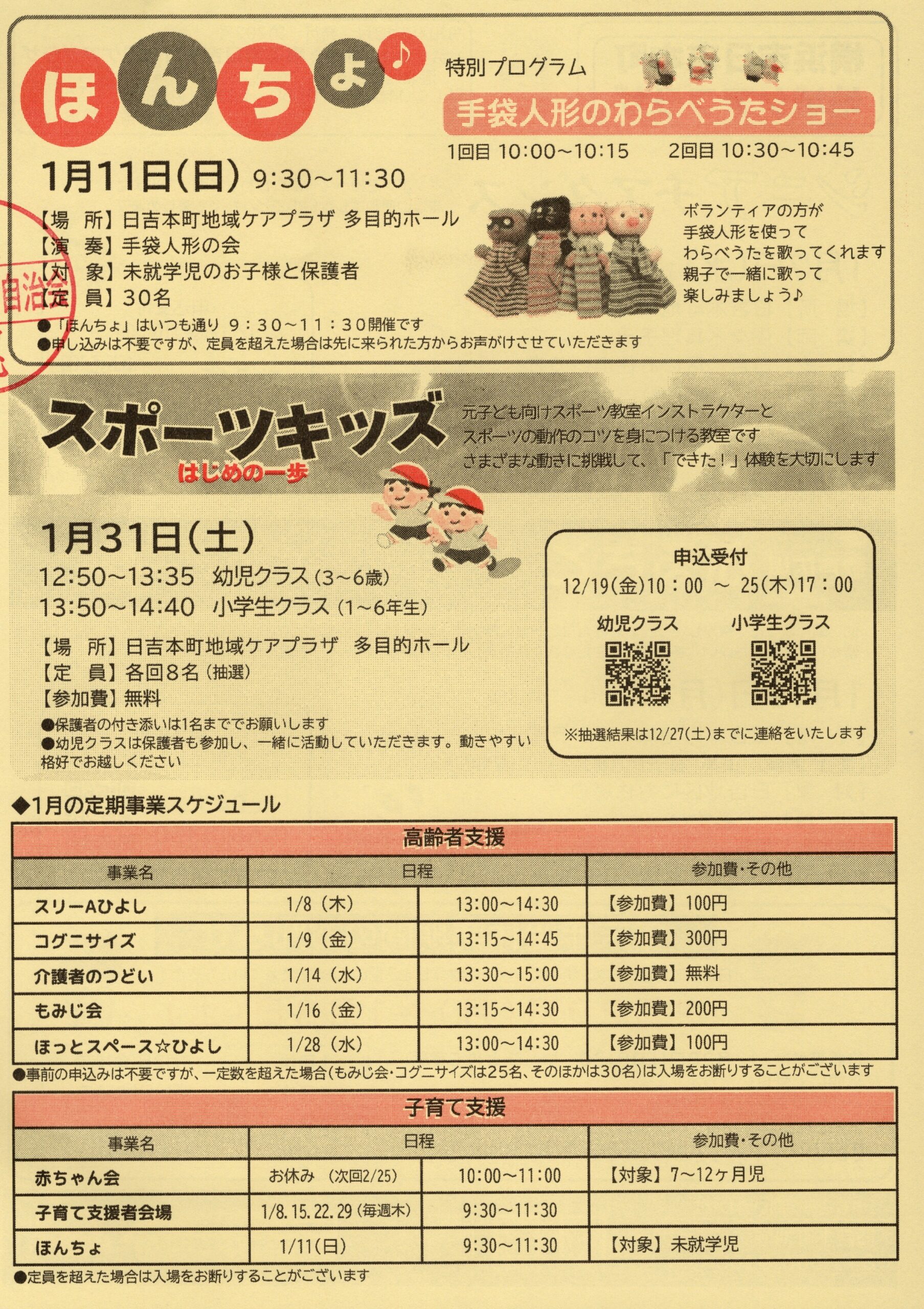 1 日吉ふくふくスポーツフェスタ開催 11月9日(日)10時〜15時 日吉台中学校 8日(土)11時〜公会堂集合7名(井上、安齋ま、松井、安齋の、岩澤、細谷、橋本)13時搬入作業 9日(日)販売担当(細谷み、野村、市之川、鈴木、勝吉、井上会長(総括))スタンプ担当(嶋田、磯貝)準備担当(松井、安齋ま、安齋の、厚川、岩澤、細谷)はんてん着用、当日会場集合9時30分 昼飯おにぎりお茶 その他準備品用意担当(松井) 9日(日)18時パームスプリングス慰労会参加者確認