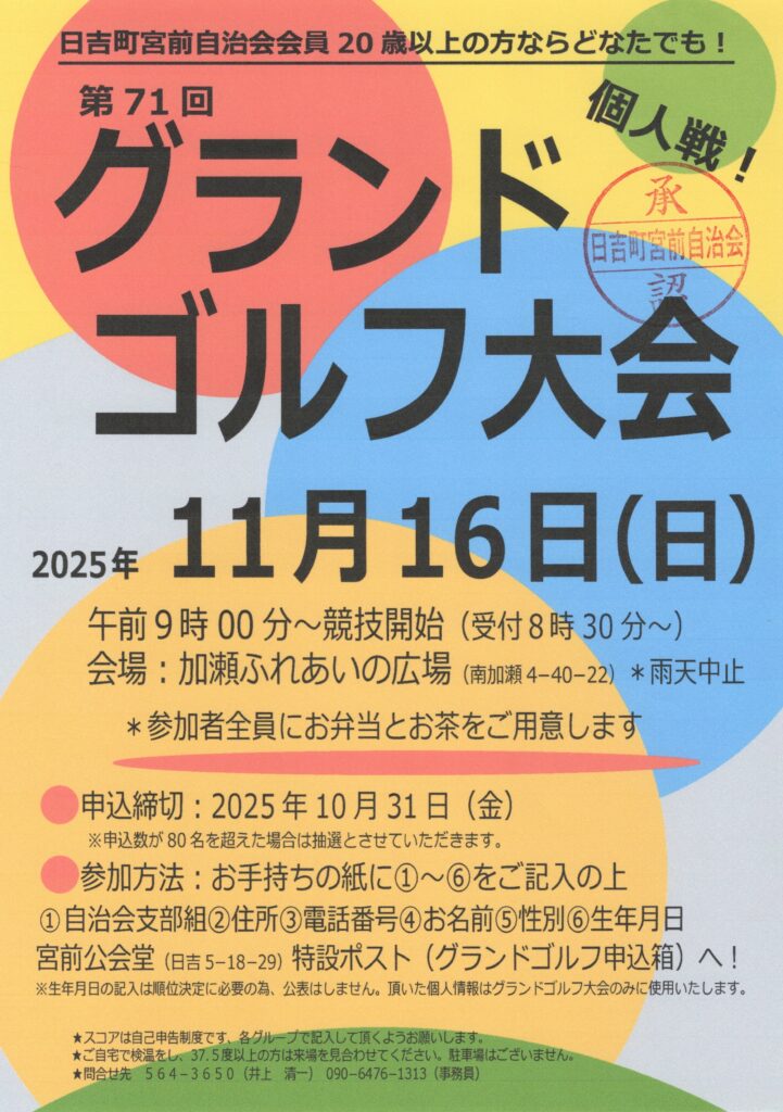 5 グランドゴルフ大会の準備 ・11月16日(日) ・担当:井上 ・募集期間10月7日〜10月30日(公会堂ポストインにて)