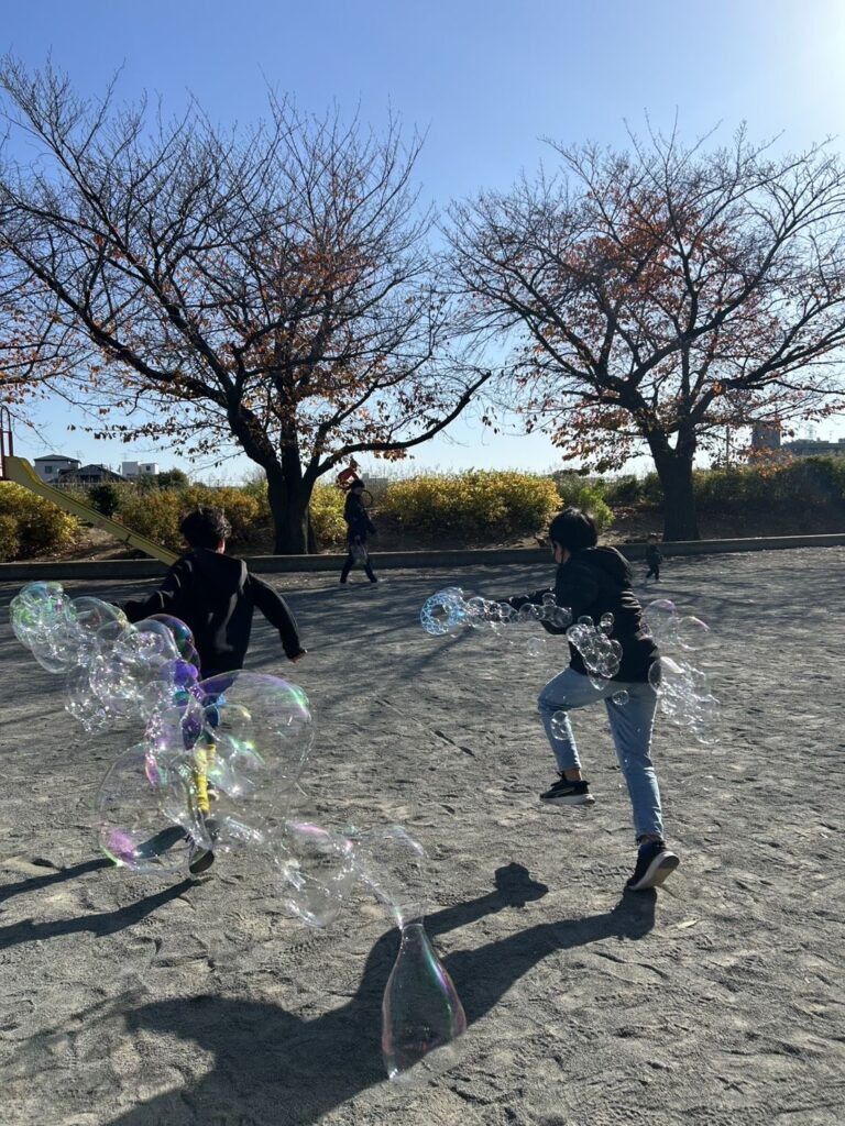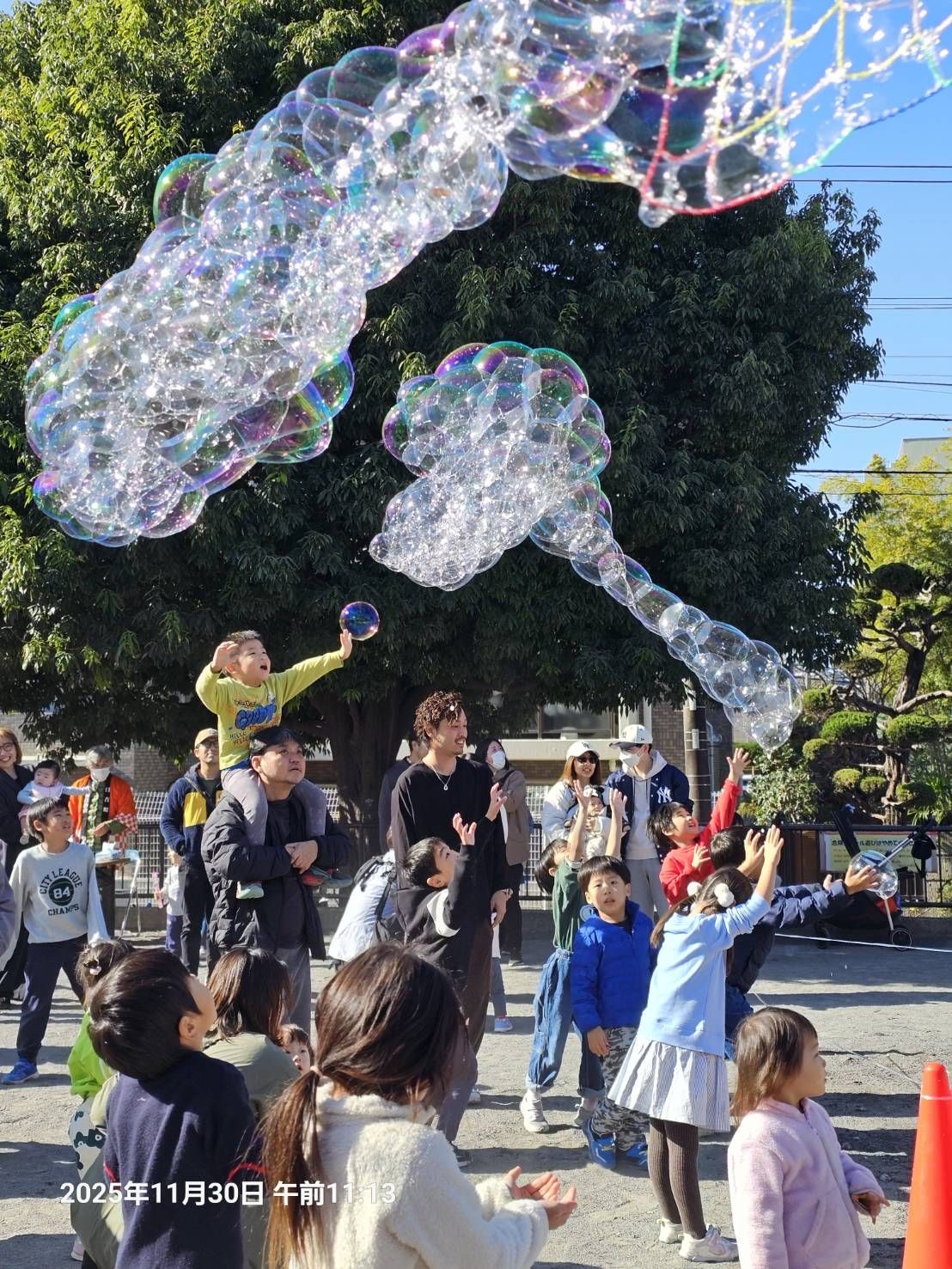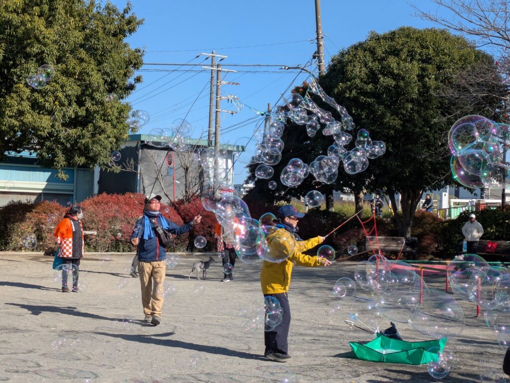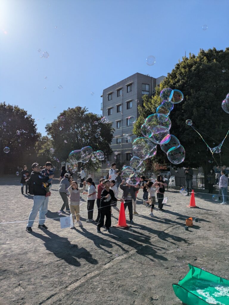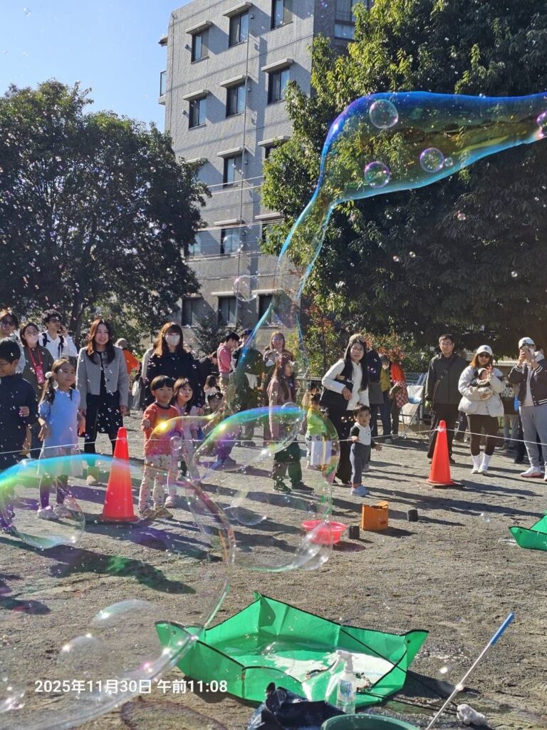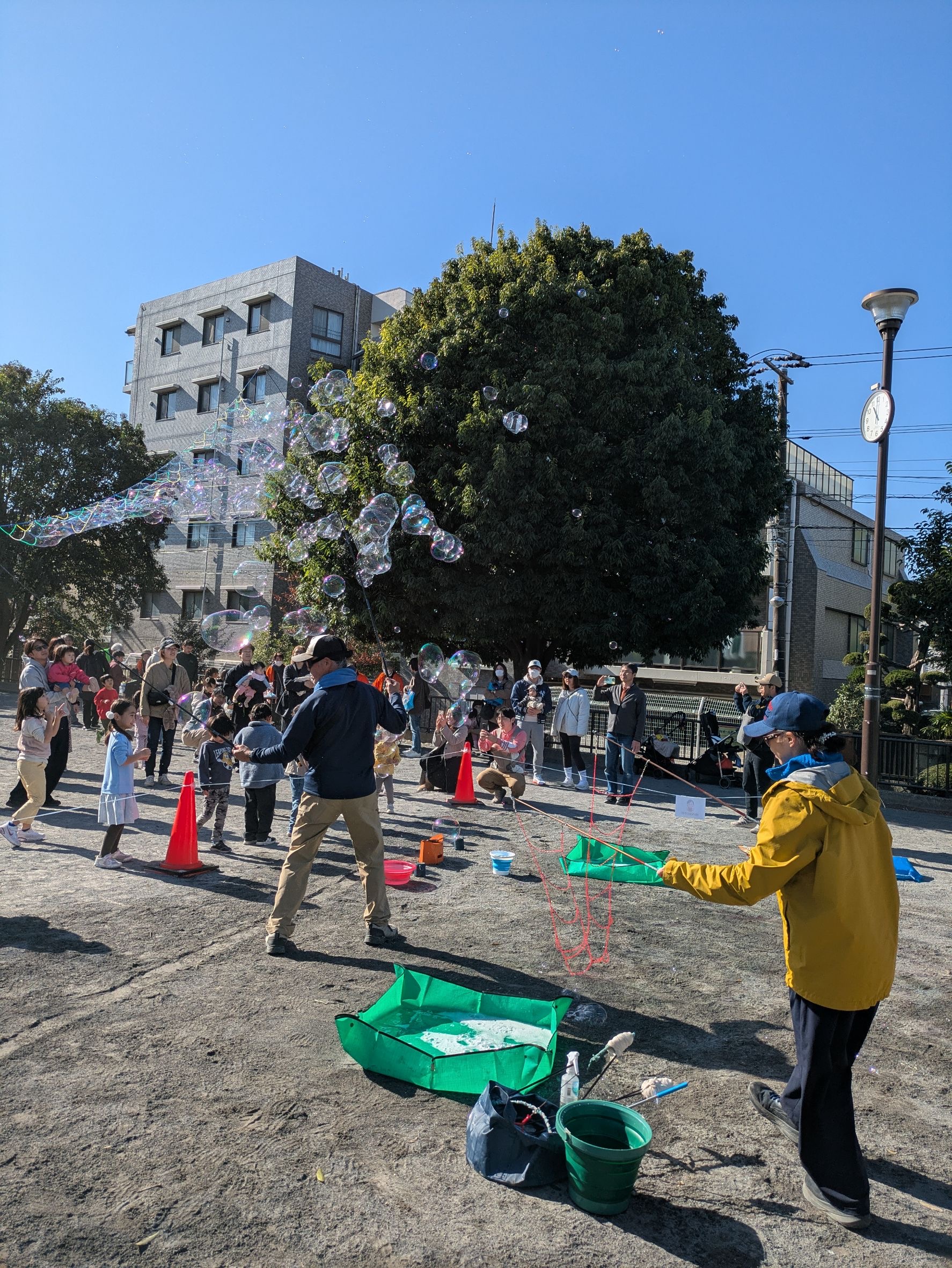 快晴の下、自治会のケア委員会が主催してシャボン玉イベントを開催しました。[今年で2回目]