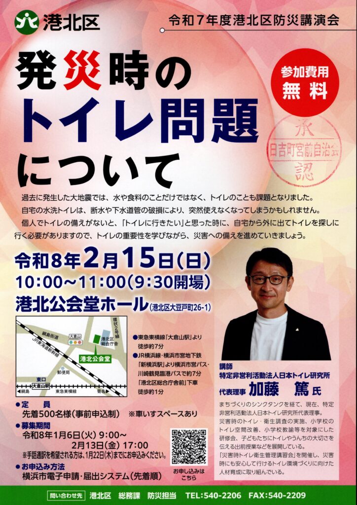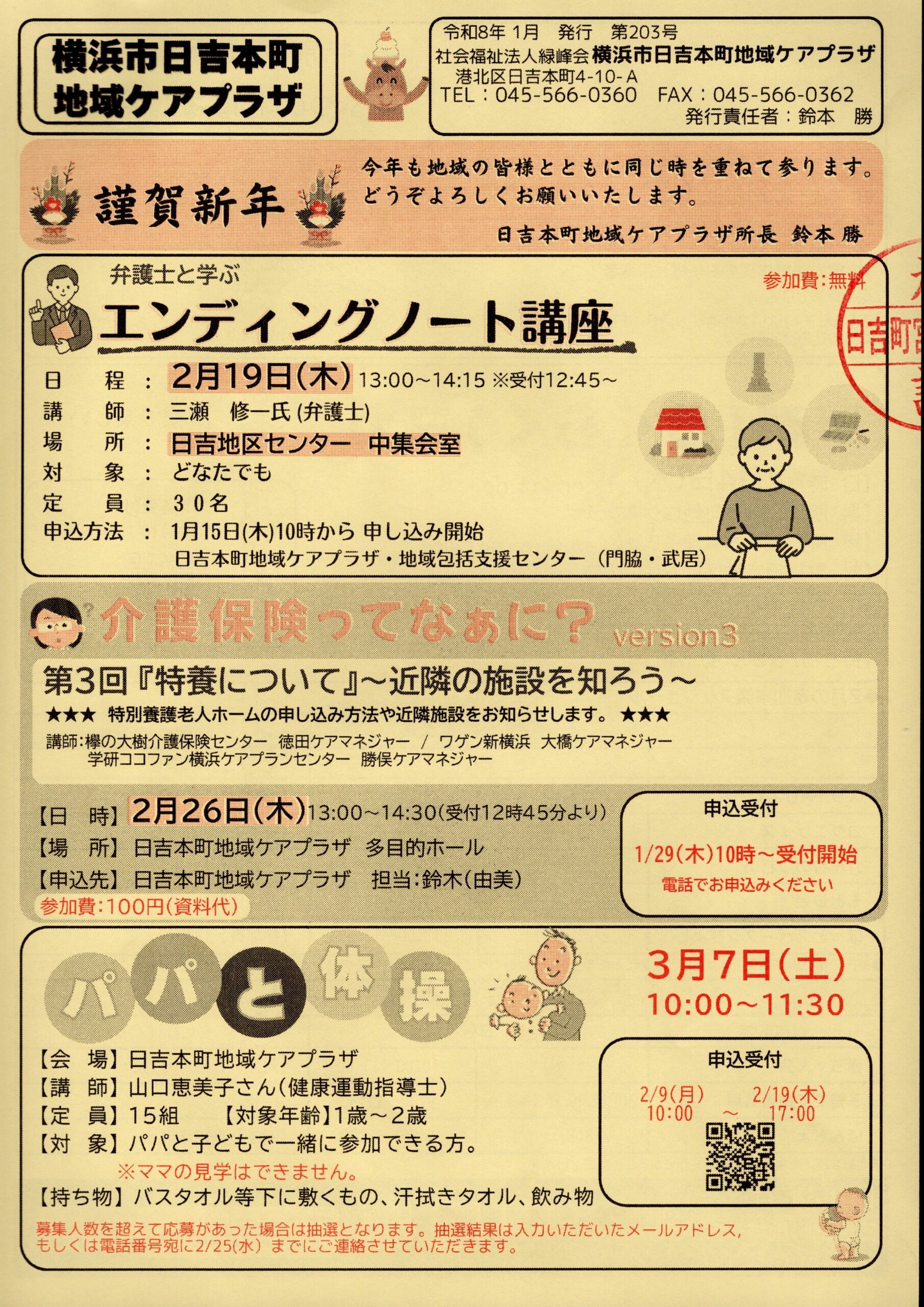 4 今後の予定 1,港北区出初式 1月10日(土)10時〜12時30分 日産スタジアム(参加:井上、安齋、嶋田、根本、田辺)2,矢上小防災拠点運営委員会 1月14日(水)9時30分〜備蓄庫の整理、確認、(区役所担当立会)簡易トイレ道具の確認作業 3,日吉地区センター子どもまつり1月12日(月)餅つき大会8時30分〜 4,日吉地区社協研修会 イーアスつくば1月30日(金)宮前より7名参加(井上、嶋田、民児協)5,日吉地区社協福祉講座 我が家の終活ノートの書き方講座 2月16日(月)10時〜日吉地区センター 民児協5名 自治会5名(井上、安齋、東埜、細谷、嶋田)