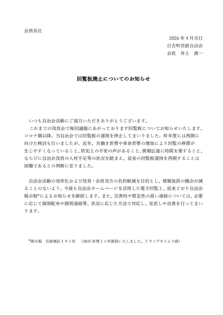 組班で回覧板バインダーをお持ちでしたら破棄してください。再利用していただいてもかまいません。お手数おかけいたしますがよろしくお願いいたします。 事務より