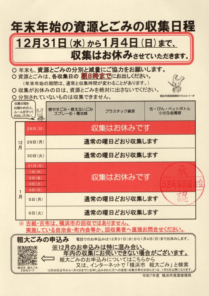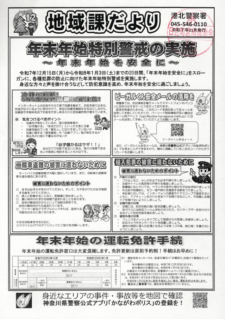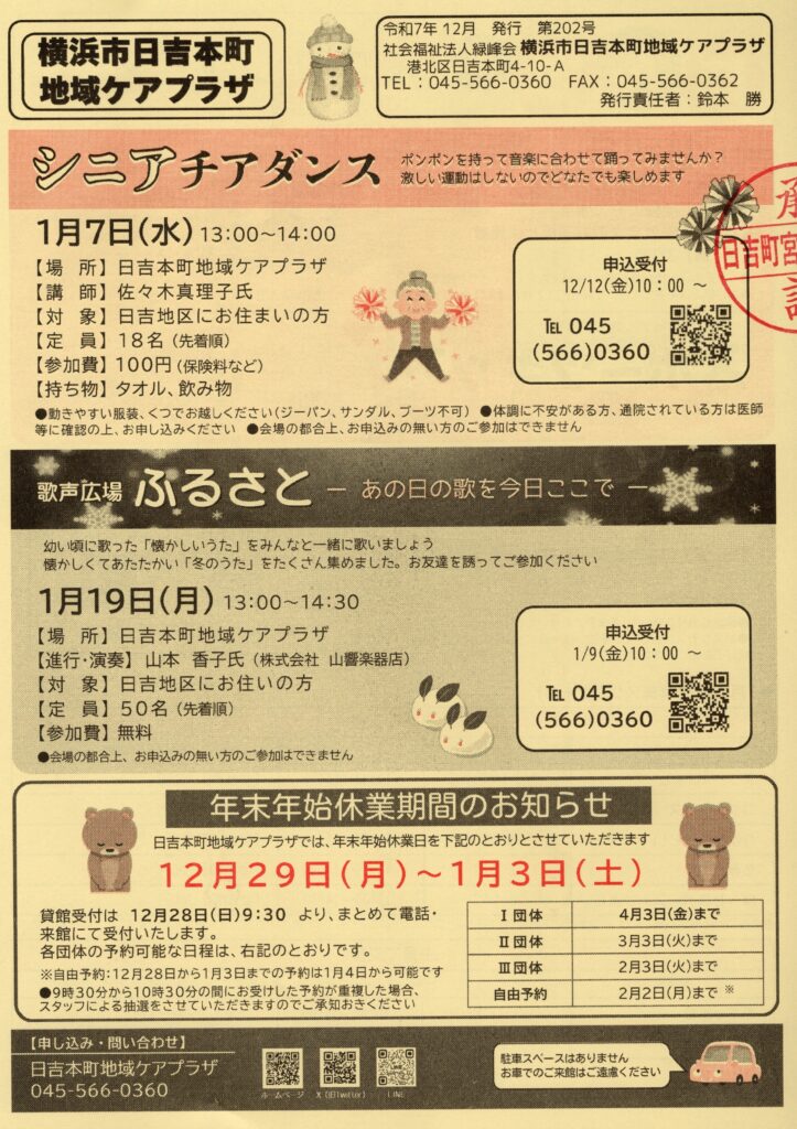 5 行政より ①日吉駅西口一方通行実施についって 工事12月1日から12月下旬 夜間0時〜6時 実施時期 12月中旬17、18、19日を予定 ②身寄りのない高齢者等への支援について チラシ・リーフレットを配布する(区役所、社協、地域ケアプラザ等)1情報登録事業 2相談窓口 3終活に関するリーフレット ③港北区消防団出初式の開催について 1月10日(土)10時〜12時30分 日産スタジアム(井上、嶋田) ④お悔やみ窓口の予約開始について お亡くなりの時に区役所で行う手続きをお手伝いする 予約受付12月9日から電話またはウエブサイトにて15日から開設 ⑤第30期横浜市青少年指導員の推薦について 令和8年4月1日より令和10年3月31日 1月末までに連町会長に推薦書を提出
